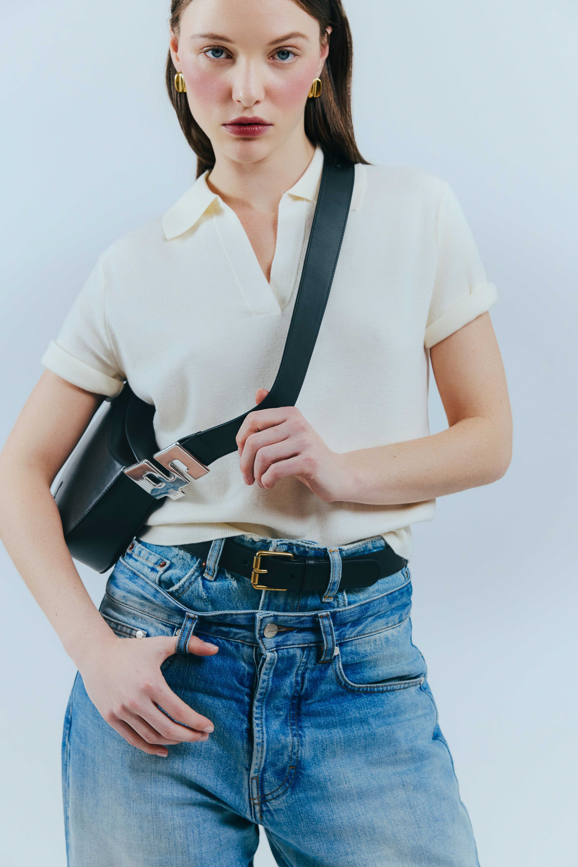 Élégant et pratique, ce sac en cuir lisse noir et sa boucle argentée vous accompagnent partout grâce à son anse réglable ornée d’une boucle argentée reprenant le blason de la marque. Chaque détail est cousu à la main pour une qualité et une finition irréprochables.