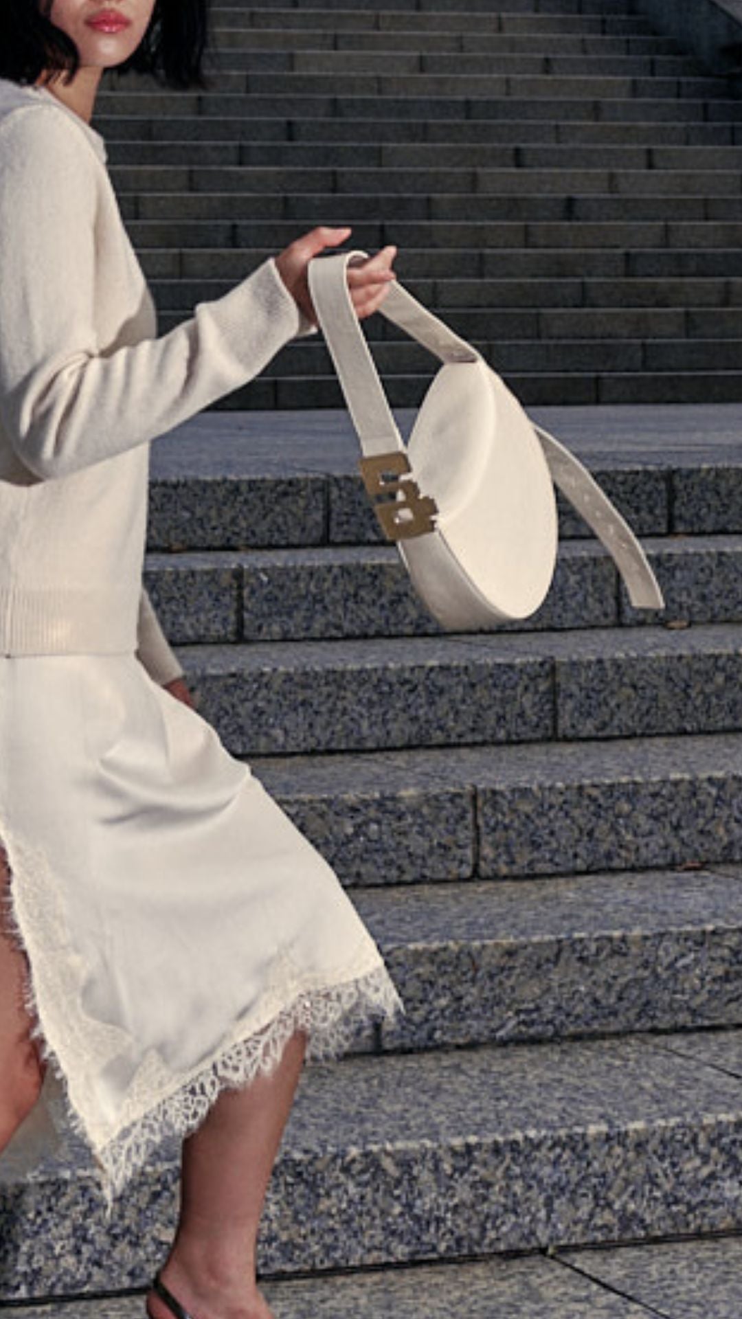 Élégant et pratique, ce sac en cuir verni ivoire et sa boucle dorée vous accompagnent partout grâce à son anse réglable. Chaque détail est cousu à la main pour une qualité et une finition irréprochables.