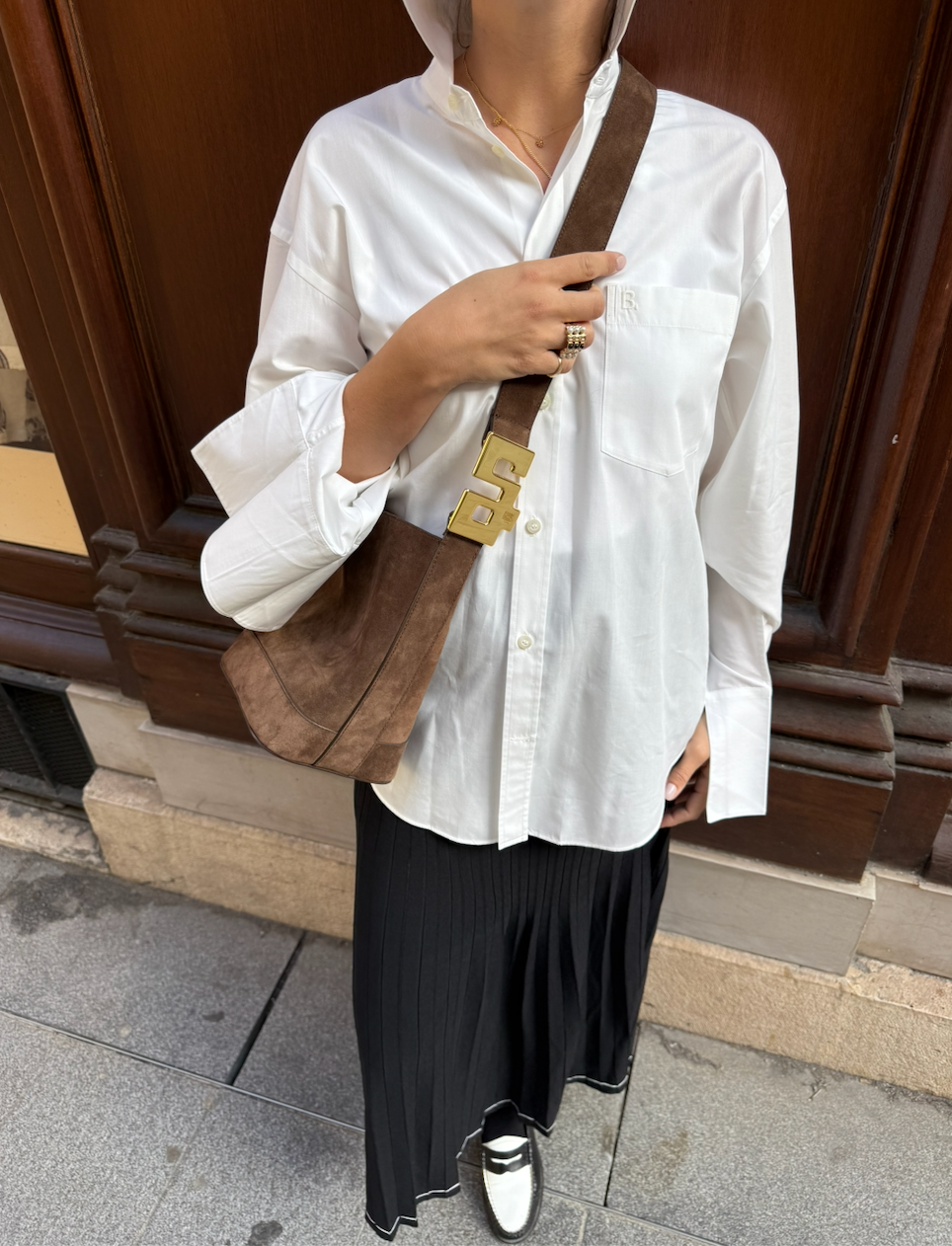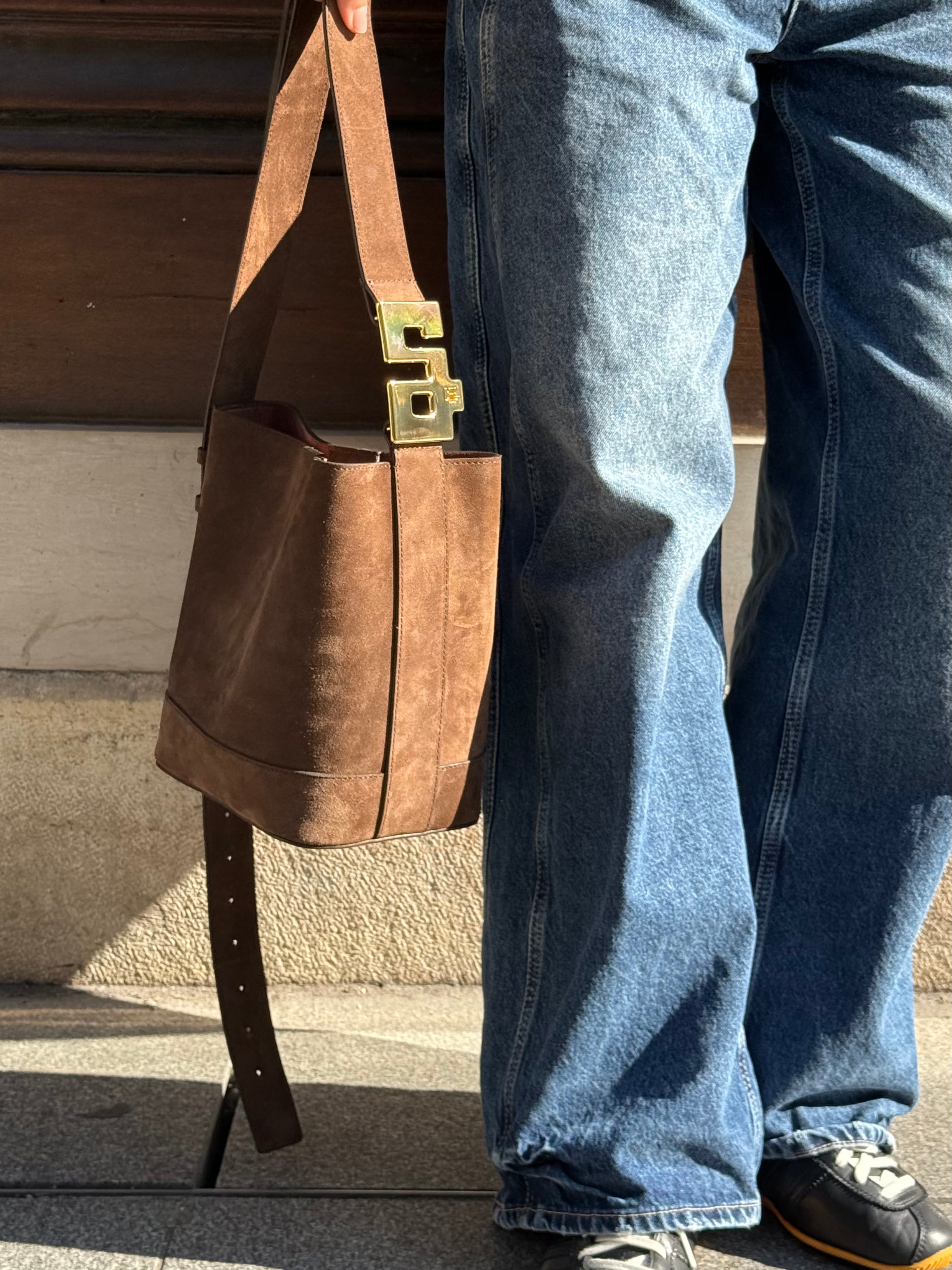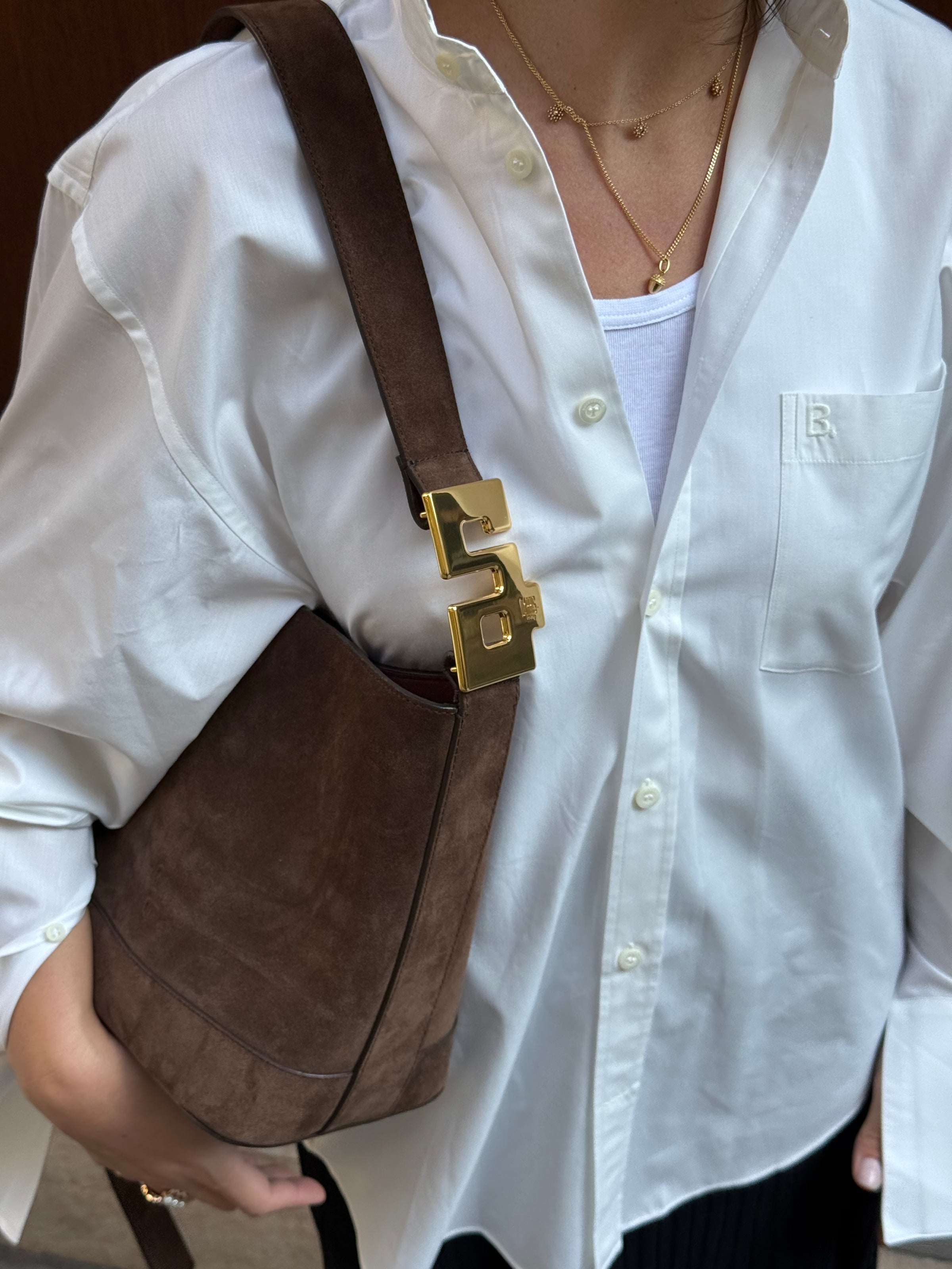 Un format iconique, revisité avec précision en cuir suédé. À l’épaule pour une ligne affirmée. En bandoulière pour plus de liberté.