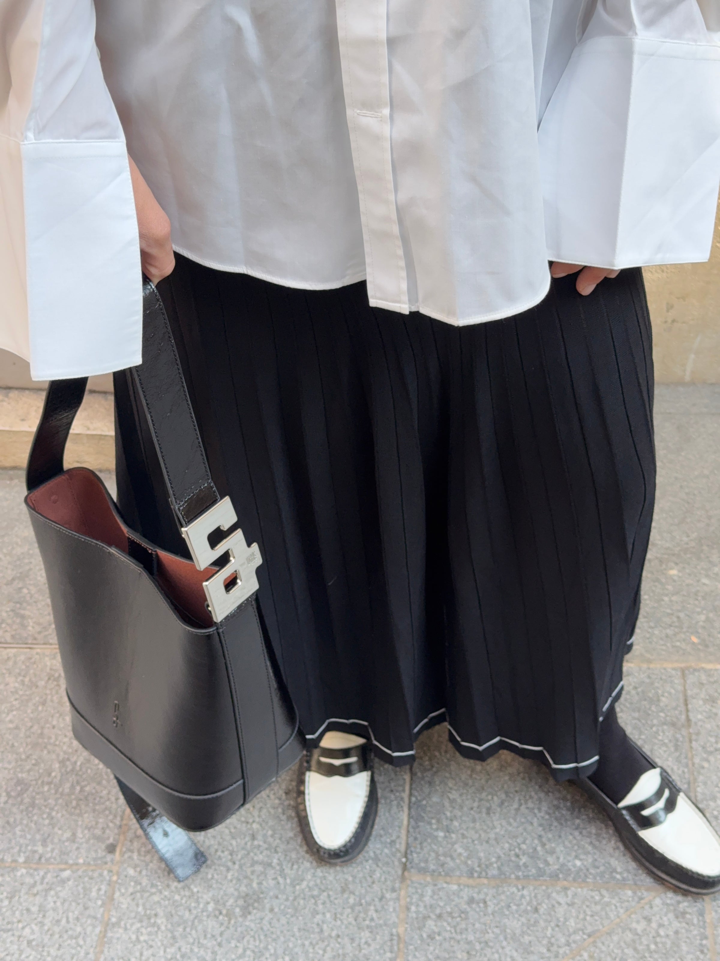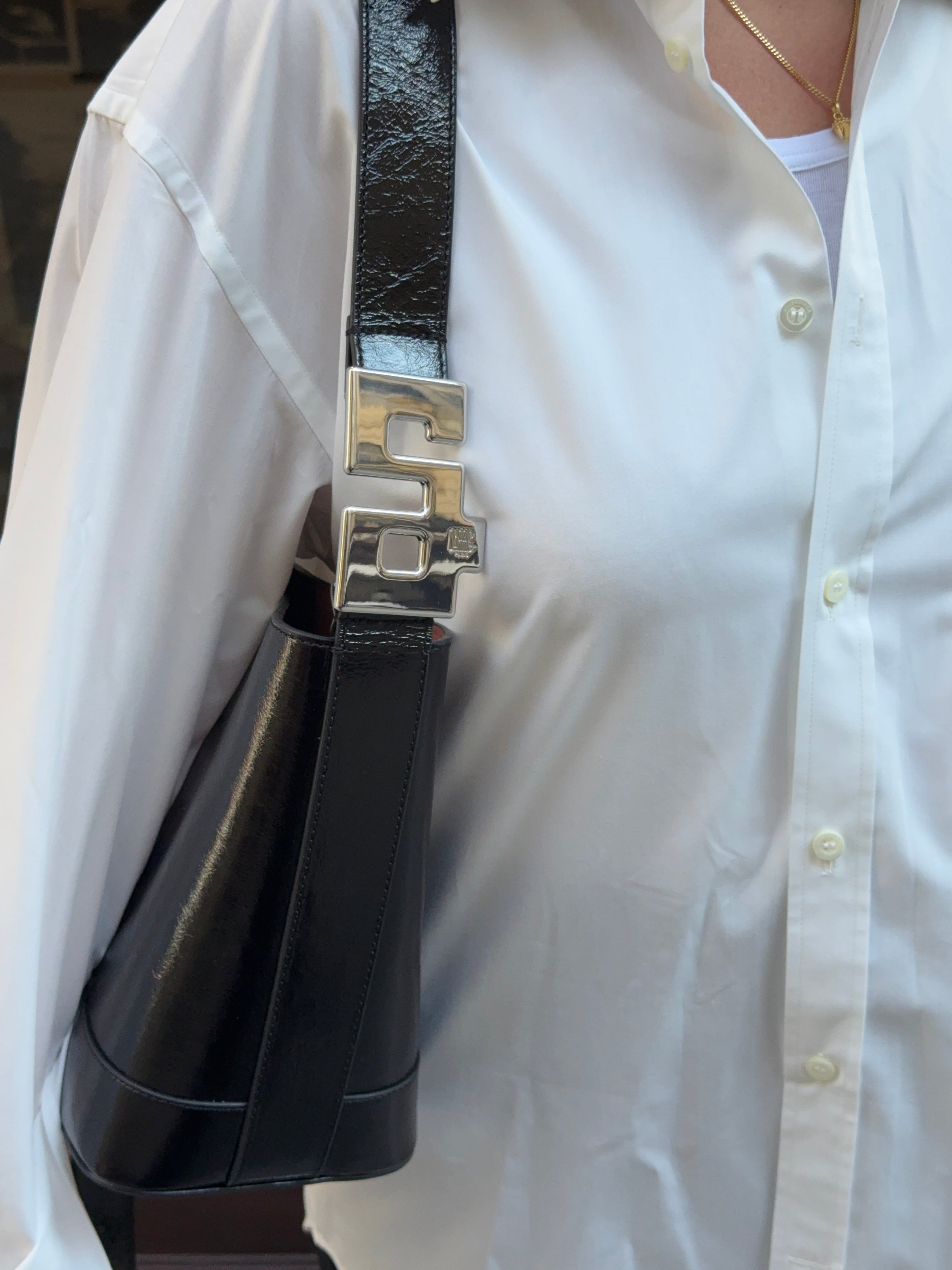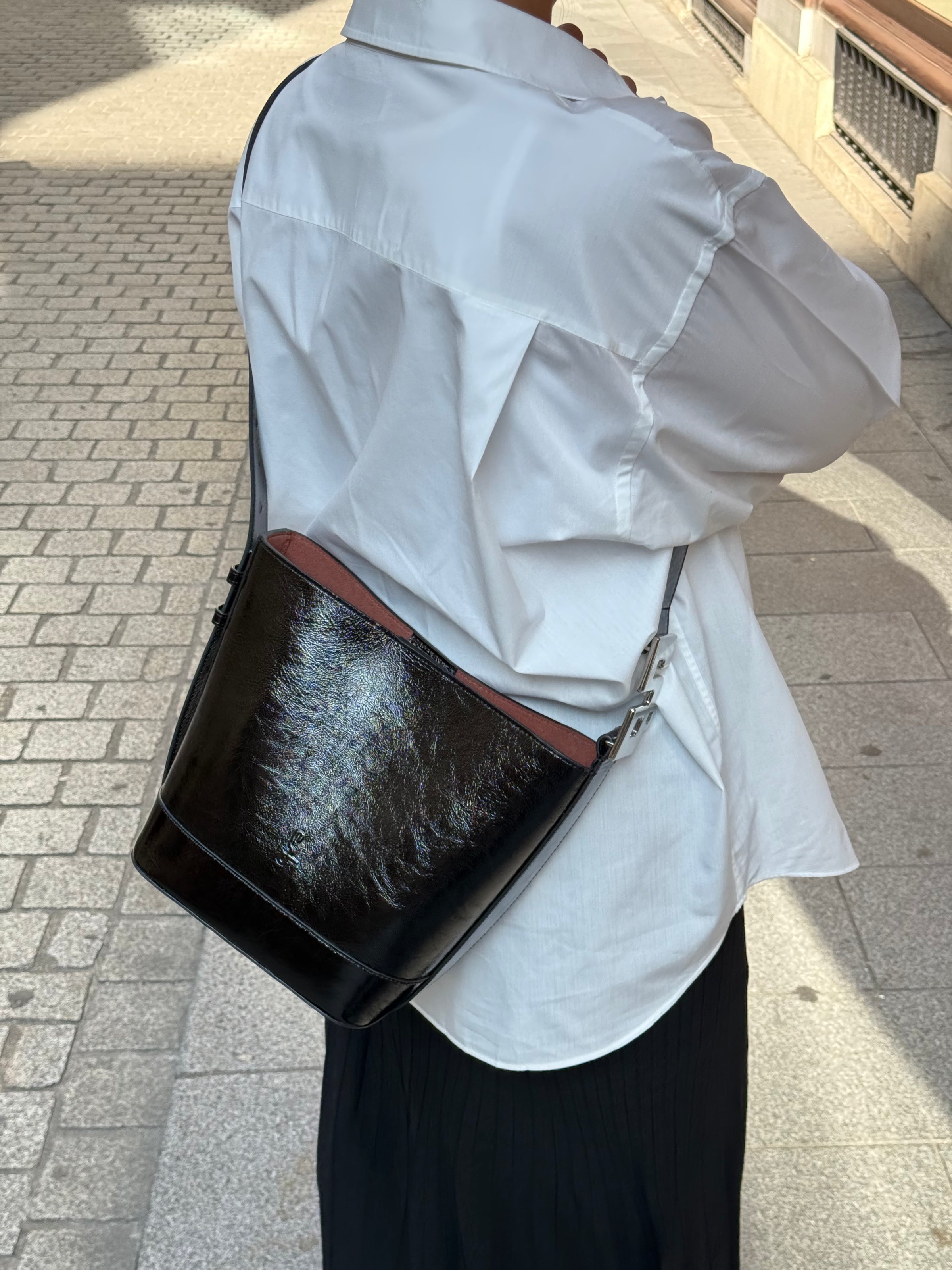 Un format iconique, revisité avec précision en cuir verni noir. À l’épaule pour une ligne affirmée. En bandoulière pour plus de liberté.