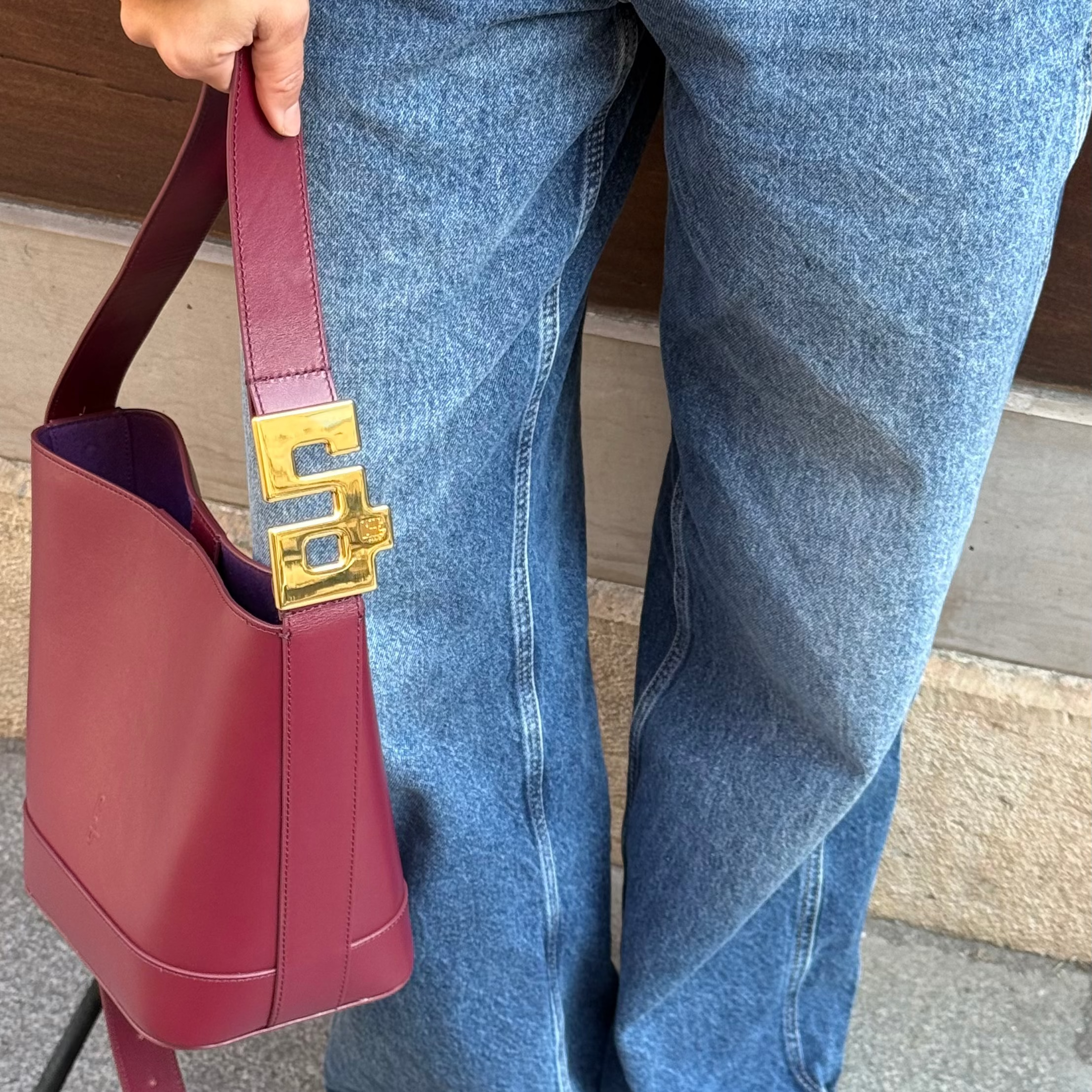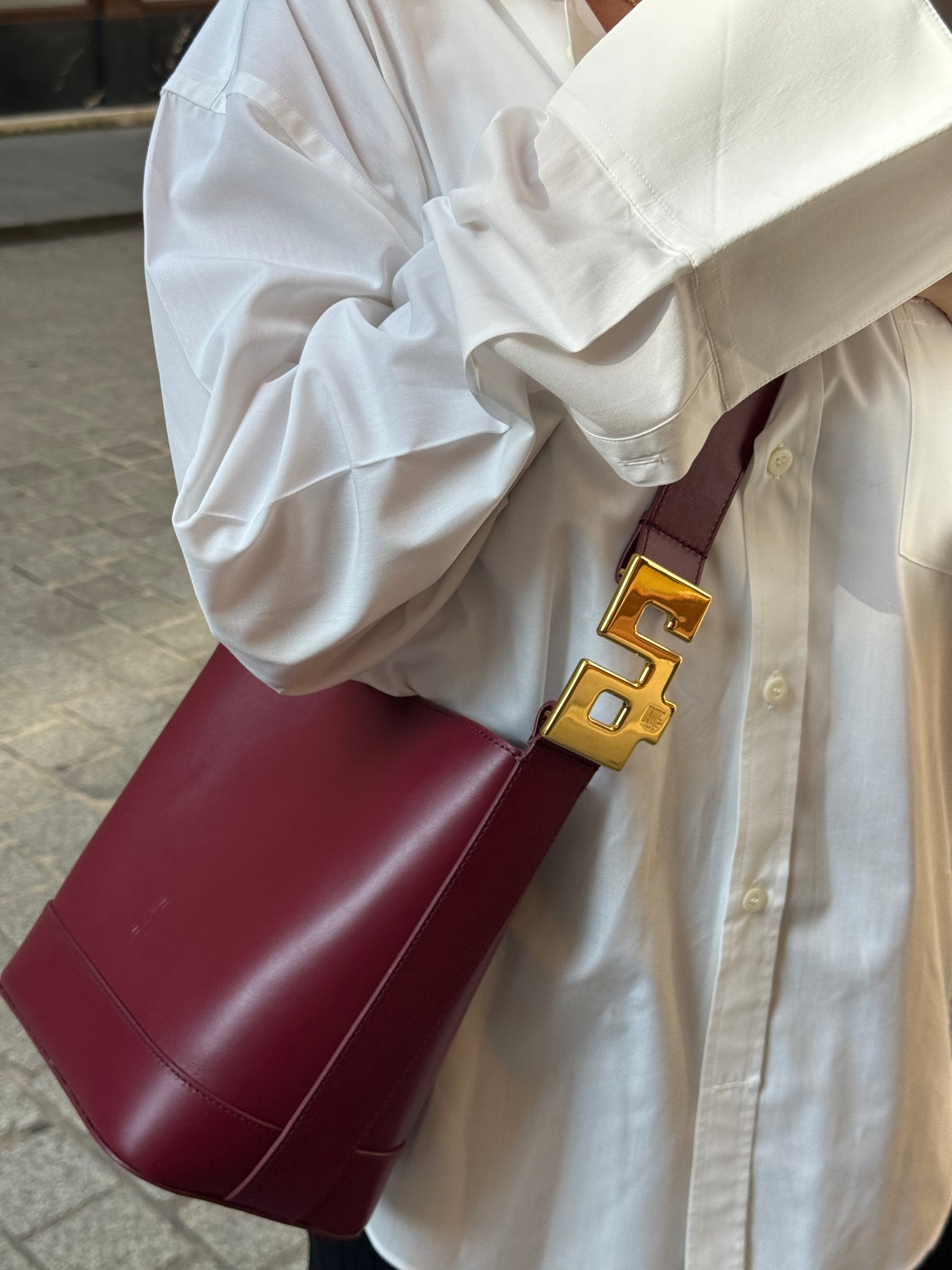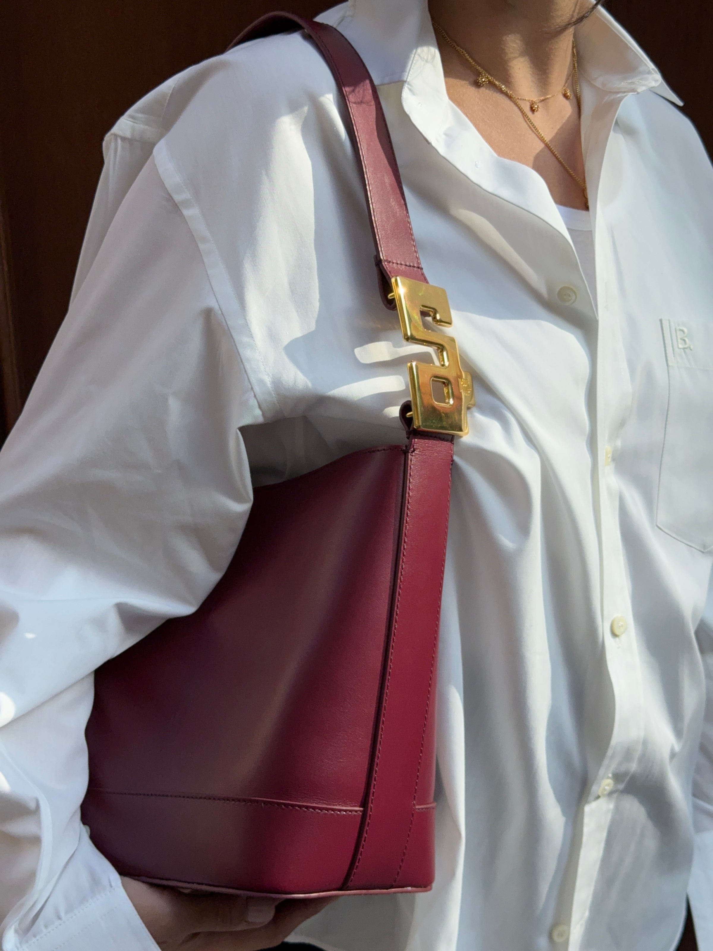 Un format iconique, revisité avec précision en cuir lisse burgundy. À l’épaule pour une ligne affirmée. En bandoulière pour plus de liberté.
