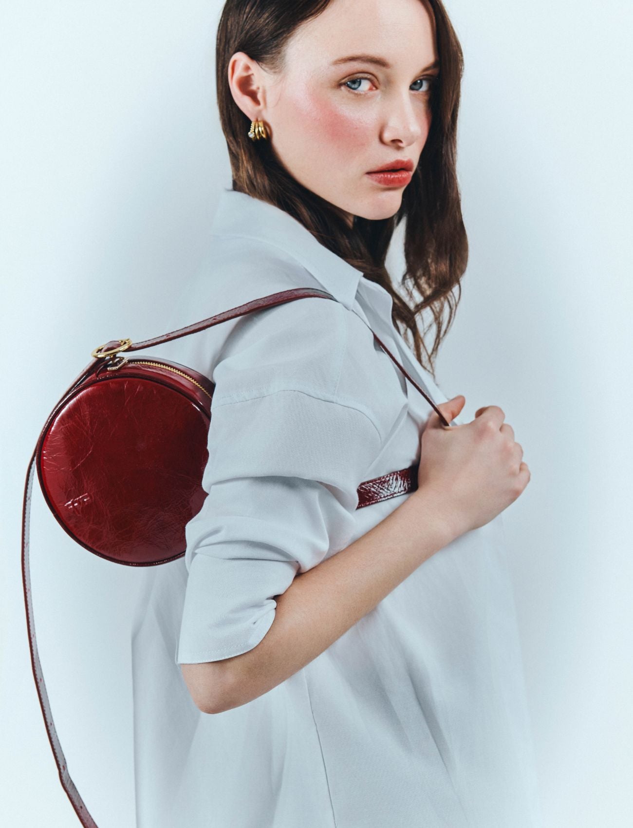 Surprenant par sa contenance, ce sac en cuir verni à l’anse réglable est entièrement cousu à la main, pour une qualité et un style unique.